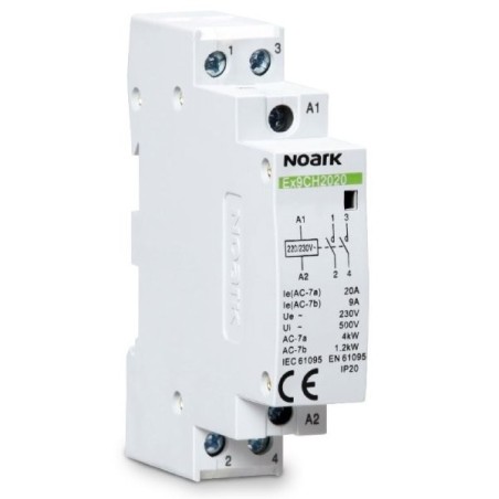 nstalační stykač relé Noark Ex9CH20 20 230V na DIN lištu je relé se 2 spínacími kontakty, max. proudem 20 A a ovládacím napětím 230 V.